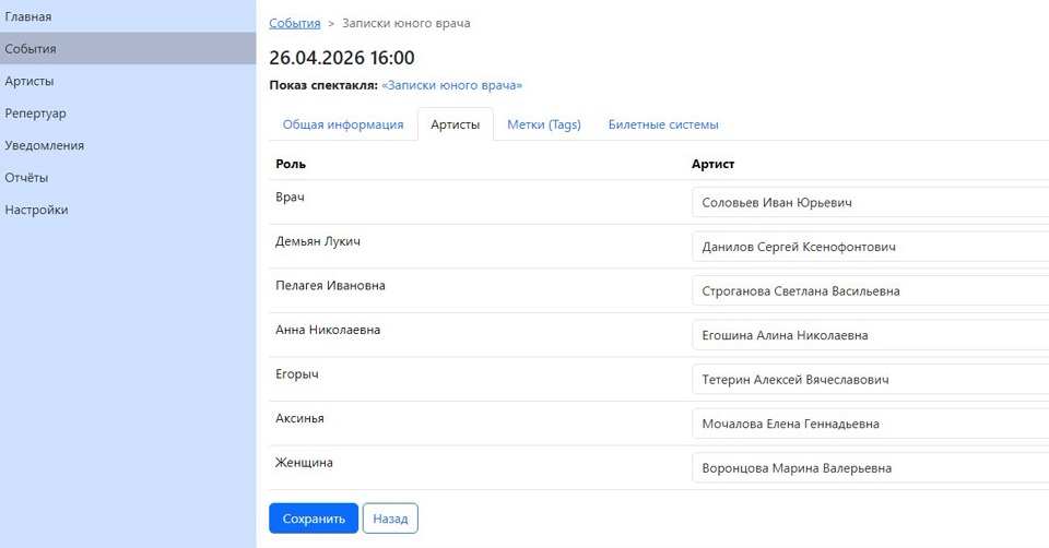 • Для события из репертуара – выберите артиста напротив соответствующей роли из списка