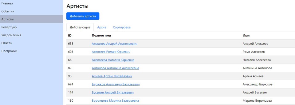 В этом разделе хранится полная информация обо всех артистах вашего учреждения.