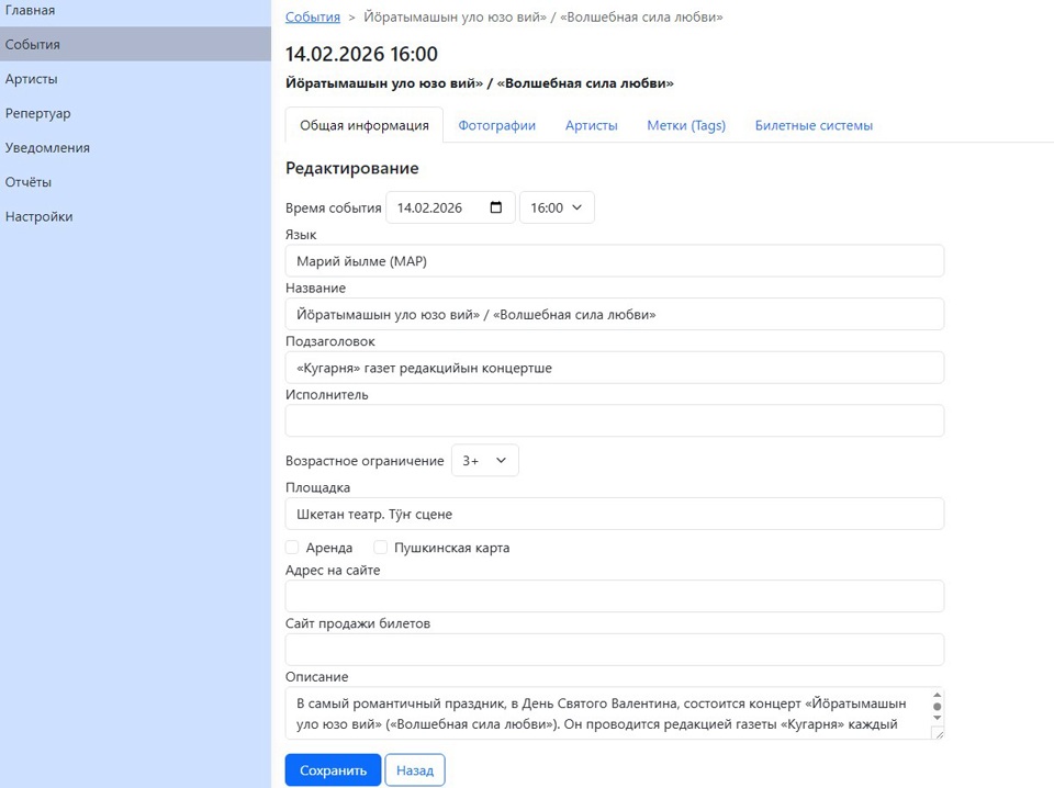 • Чекбокс "Премьера" – отметьте для премьерных показов спектаклей