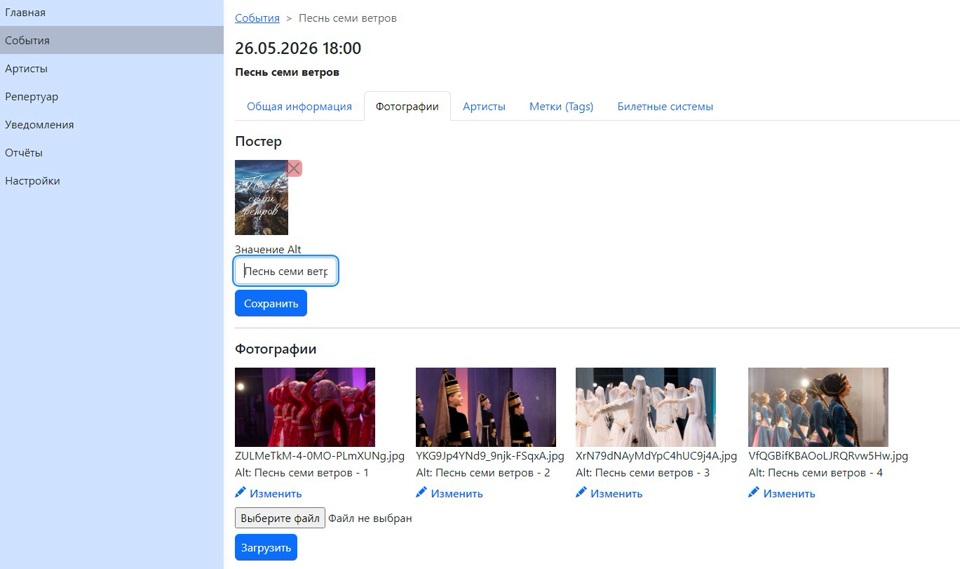 • Основное фото – загрузите портрет артиста для использования в афишах и на сайте