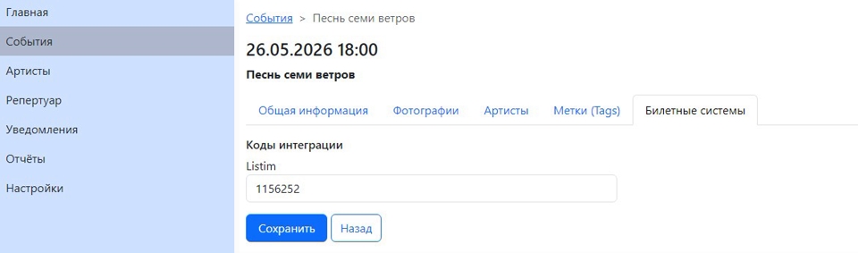 • Укажите ID события из билетной системы. Обеспечьте синхронизацию с системами продажи билетов.